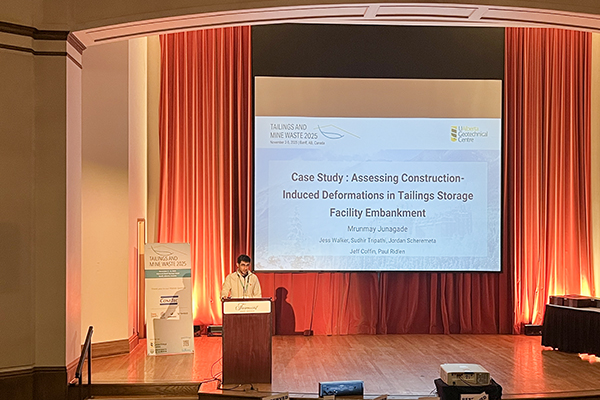 Mrunmay Junagade, a geotechnical engineer at Knight Piésold USA, presented “Case Study: Assessing Construction-Induced Deformations in Tailings Storage Facility Embankments” during Technical Session 2.3B. The paper, co-authored by Jess Walker, Sudhir Tripathi, Jordan Scheremeta, Jeffrey Coffin, and Paul Ridlen of Knight Piésold USA, describes a methodology that uses in-situ deformation data from inclinometers installed within two tailings dams to assess embankment performance through back-analysis using numerical modelling.